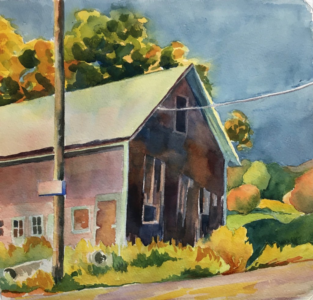 This is my neighbor’s barn and after 25 years of walking it by suddenly saw an appealing angle to paint it from. It was a dark sky behind with full late afternoon sun shining on the building giving a dramatic show of light. I usually do these in watercolor as a practice before doing them in oil. This is another triad of Prussian Blue, Hansa Yellow, and Alizarin Crimson.
