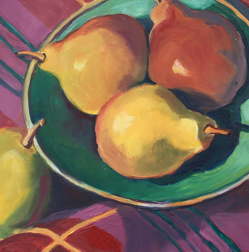 These Seckel Pears were at our coop and so beautiful I couldn’t resist. The bowl is from a local potter, the teal green glaze really sets off the golden reds in the pears. It gets even better when I can use the red plaid T towel hand woven by my cousin. This painting measures 6×6” and is painted with oils on a cradled gesso board.