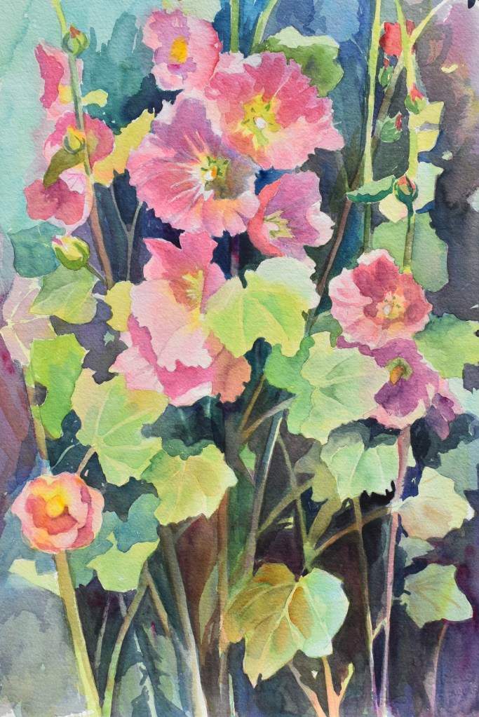Hollyhocks from my garden painted in my studio. Your painting will ship ready to be framed via priority mail free of charge.