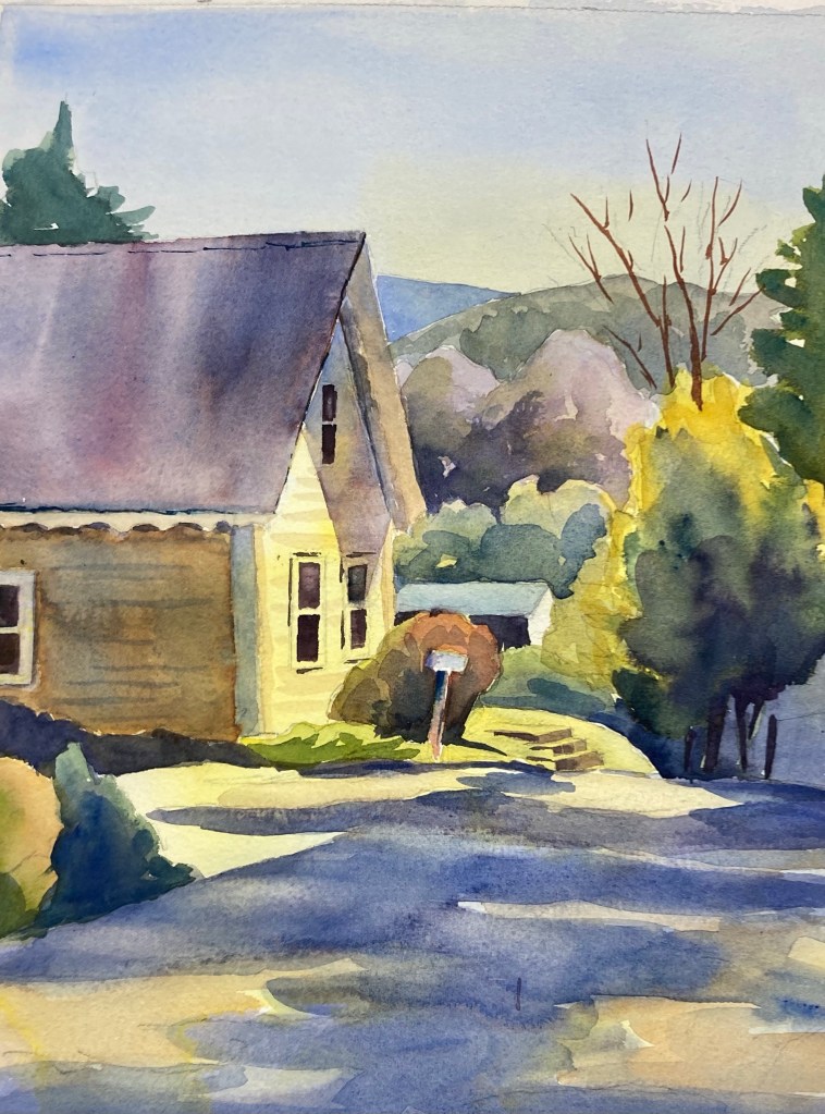 This pretty house is in East Hardwick, Vermont and I found it while I was getting my tires changed. I’ve always liked yellow houses. This was painted with hands yellow, ultramarine blue, and alizarin crimson.