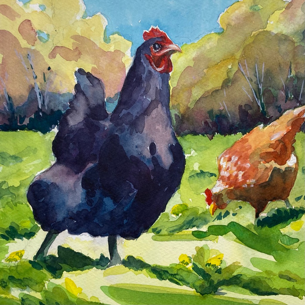 It’s been fun having chickens this summer. Their many mechanical poses are so interesting and entertaining. This Australian hen has the advantage of the graphic black and red colors which make a painting quite bold.