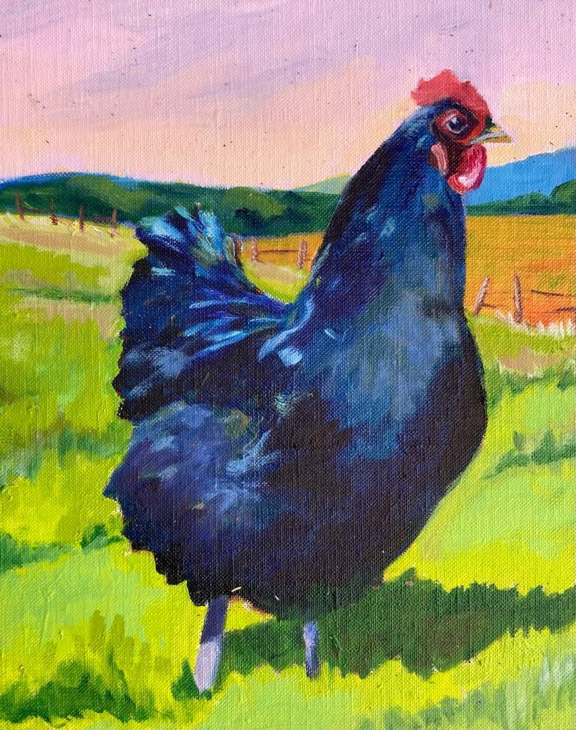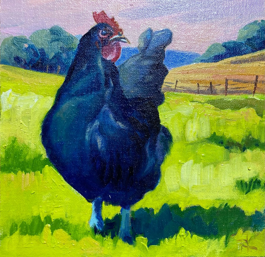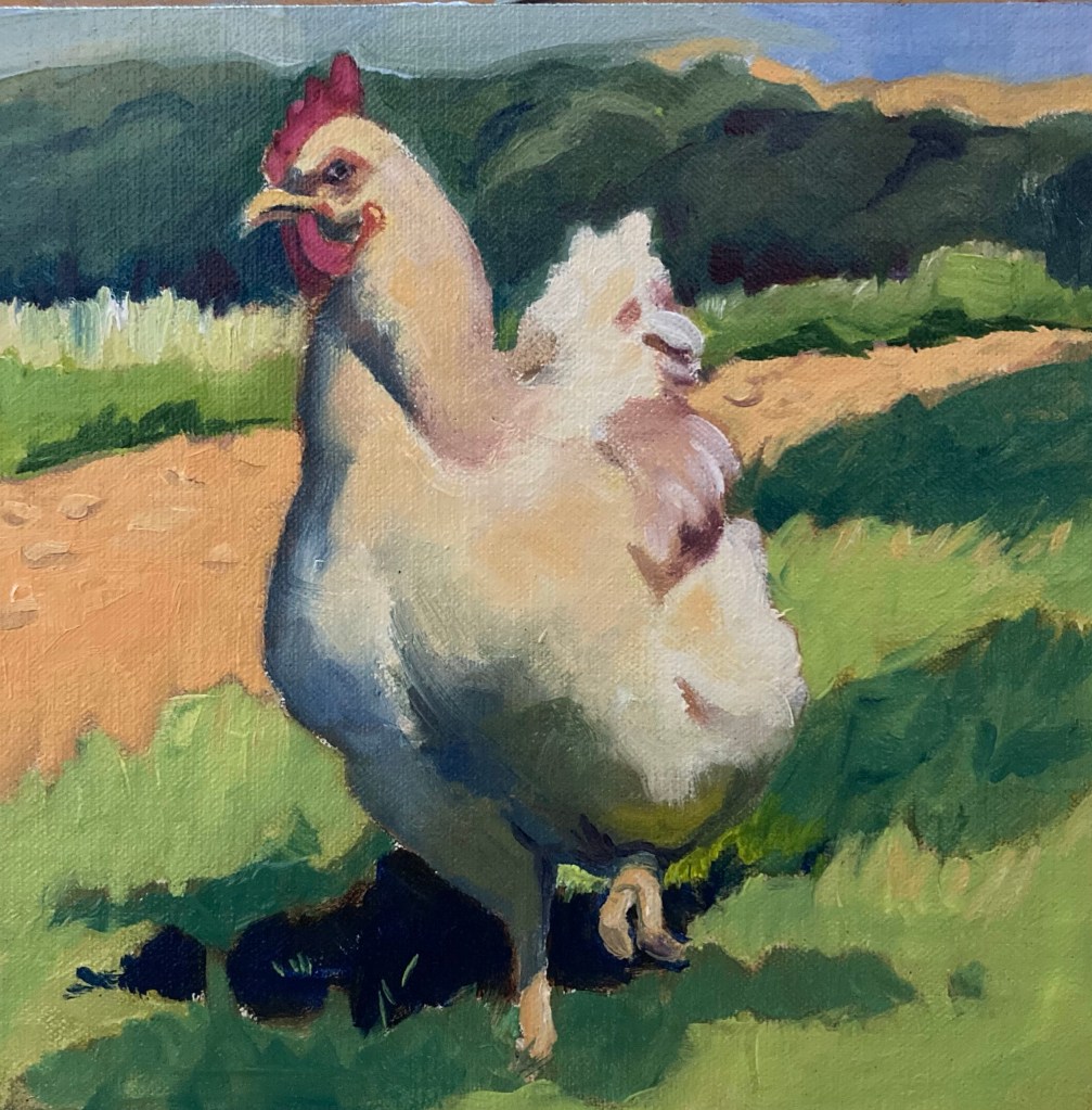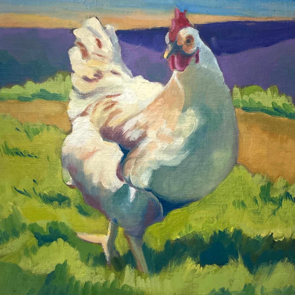 I’ve been on the roll with chickens lately working in oil. These small 8×8” square and one 8×10” paintings were fun and unsophisticated way to get back into oils. The white hens are my neighbors and the black hen is from my small flock.