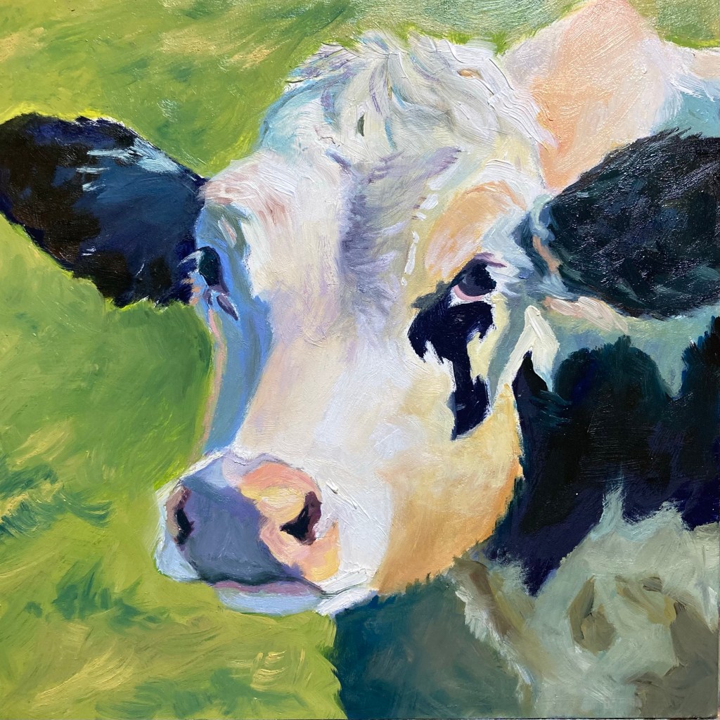 This is a young heifer nearby in one of our fields. She came up to me looking for a fist full of grass. This is an oil measuring 8×8” on a Gessoboard.