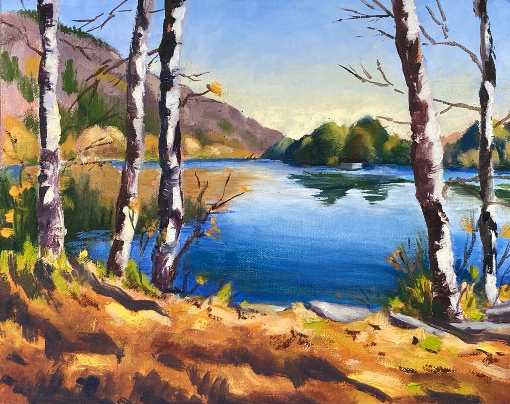 Here s a small oil from a nearby lake after the the peak of foliage season .