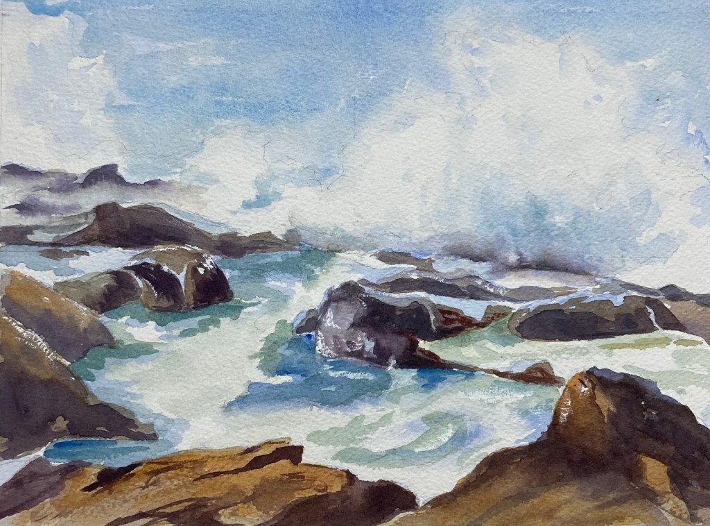 Practicing waves from Poppy Balser’s tutorial on the CSPWC online offering of lessons https://cspwc.ca/education-a-streamable-video-demonstration-with-poppy-balser-cspwc/ The video lesson sorta takes the mystery out of painting surf